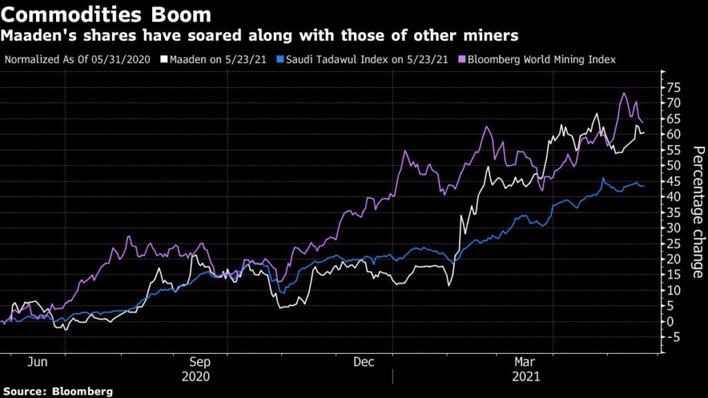 Maaden’s profit increased to 761 million riyals ($203 million) in the first three months of 2021, the highest quarterly figure since 2013. The company’s shares have gained 42% this year to 57.40 riyals, giving it a market capitalization of $19 billion.