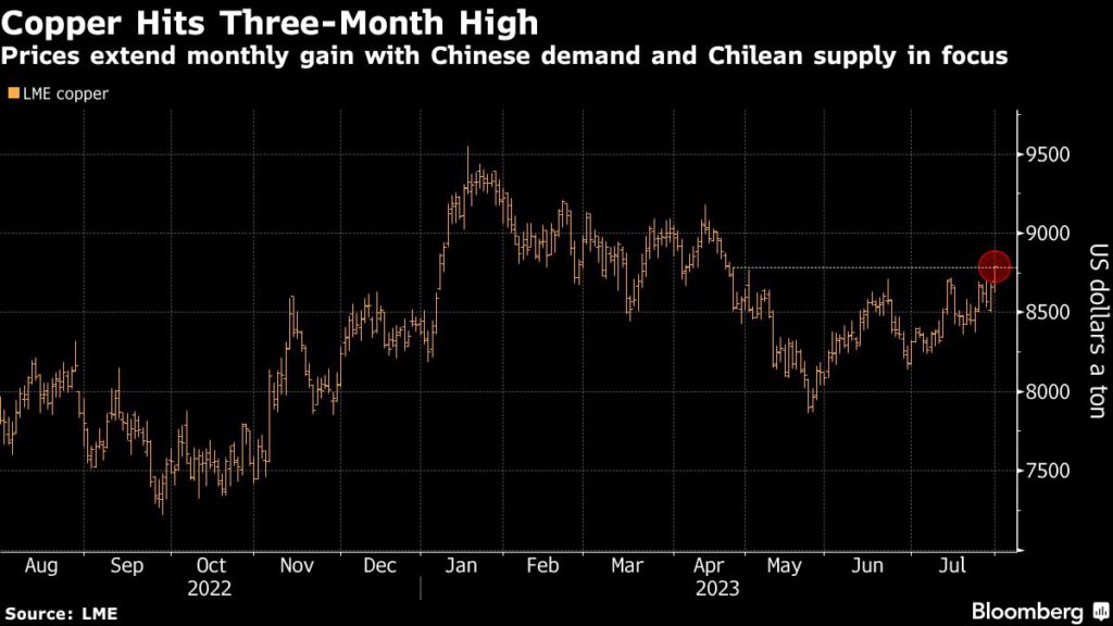 Copper hit a three-month high as it headed for its biggest monthly advance since January, supported by growing optimism over Chinese demand and mounting supply risks in Chile.