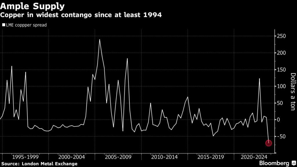 Copper’s contango widest since at least 1994 as inventories rise
