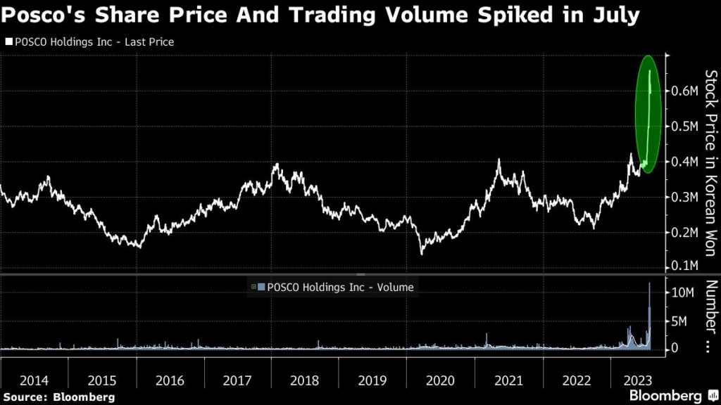 Thanks to purchases by retail investors, Posco Holdings’ increase in market cap in July was the biggest among all South Korean shares, according to exchange data. It was also the most traded stock during the month, with turnover surpassing even that of Samsung Electronics Co., the country’s largest company.