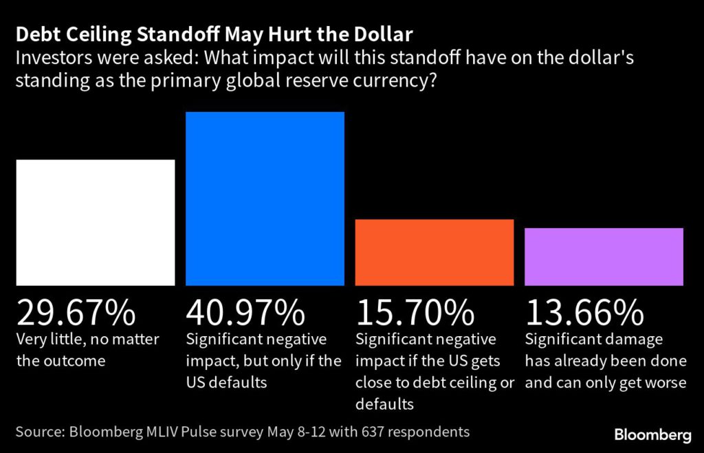 Some investors believe that the debt ceiling drama has already caused some harm to the dollar, and 41% say its standing as the primary global reserve currency is at risk if the US defaults.