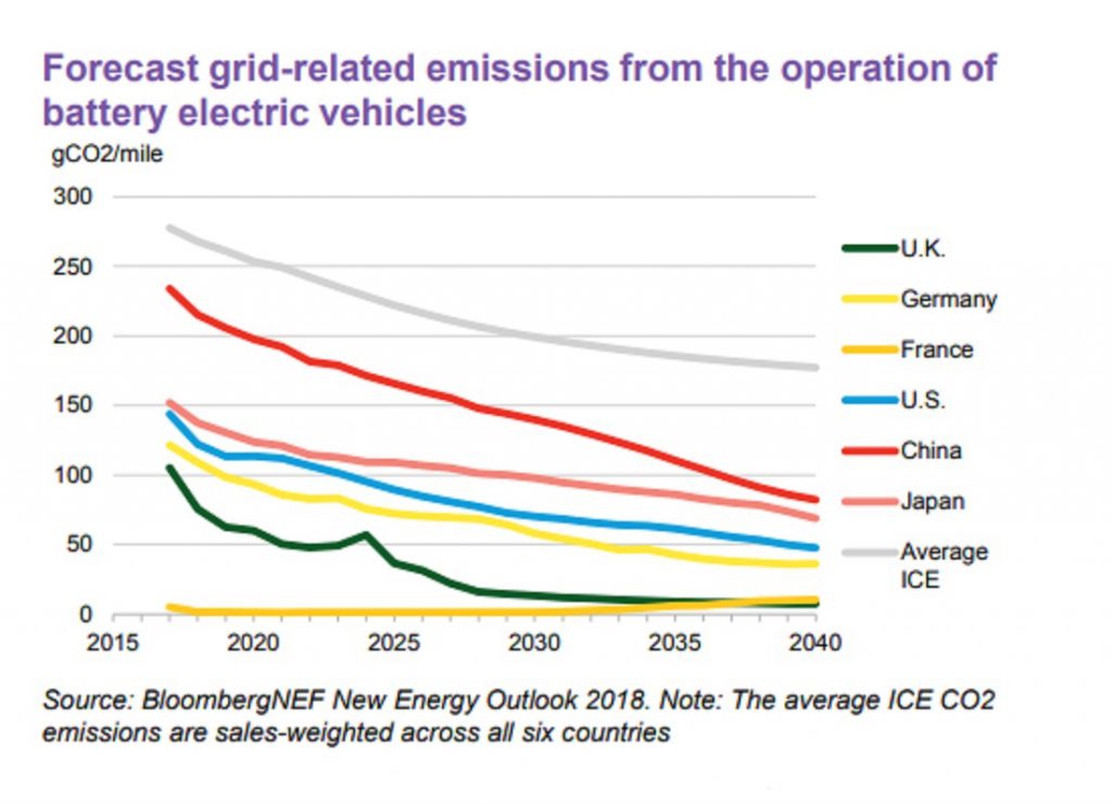 That’s the conclusion of research by BloombergNEF, which found carbon dioxide emissions from battery-powered vehicles were about 40 percent lower than for internal combustion engines last year. The difference was biggest in Britain and the U.K., which have large renewables industries. It still held in China, which is more reliant on coal to make electricity.