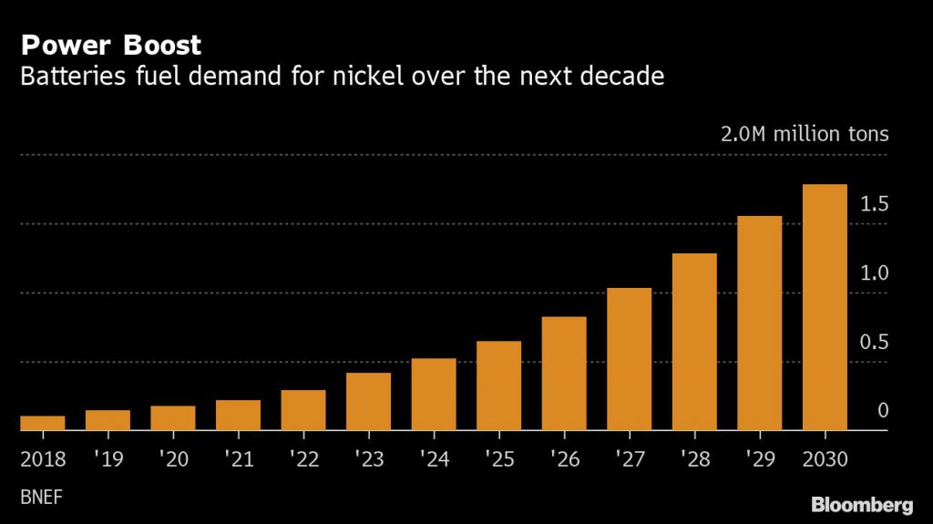 EVs will comprise 58% of global passenger car sales in 2040, compared with 10% by 2025, according to BloombergNEF. Nickel helps cram more energy into cheaper and smaller battery packs, allowing EVs to charge faster and travel farther between plug-ins.