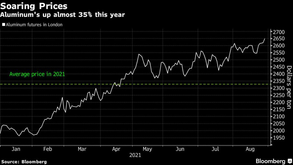 Aluminum — a light, easily-recyclable metal used in everything from beer cans to plane parts and which may be used more often in electric vehicles — has climbed as major economies recover from the Coronavirus pandemic. Futures in London are up almost 35% in 2021 to $2,650 a ton, the highest in around a decade.