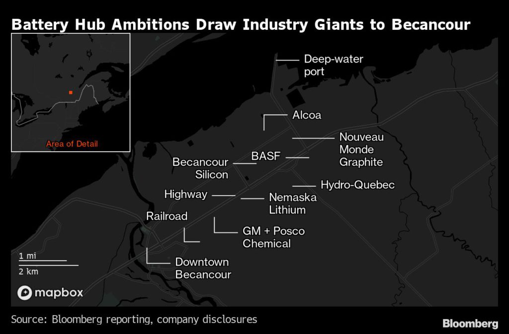 Besides cheap, renewable power that can feed an energy-intensive manufacturing industry, Becancour’s other competitive advantages include ease of access to US and European markets via major roads, railways and shipping along the St. Lawrence. The city is also close to a resource-rich region of Quebec that boasts an abundance of battery metal deposits.