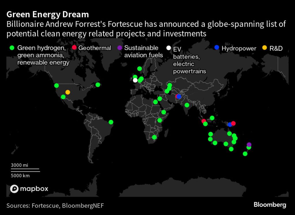 Iron ore still provides nearly all of Fortescue’s $17 billion of annual revenue. Yet Forrest has in recent years announced ambitious plans for Fortescue Energy, the green arm established in 2020, including producing 15 million tons globally of green hydrogen using renewable power by 2030. That equates to nearly half of the total global supply anticipated by BloombergNEF that year.