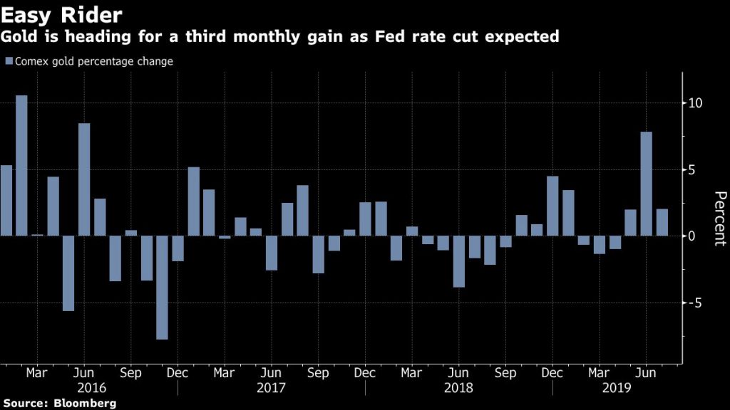 Gold may be poised for a breakout year, with prices on course for a third monthly gain, as investors anticipate rate cuts from the Fed as growth slows and trade-war frictions bite. Bullion has also drawn investor interest as other risks mount, with tensions rising in Europe over Brexit, and in the Persian Gulf between Iran and western nations. Adding to signals of an economic slowdown, data from China Wednesday showed manufacturing shrank again in July.