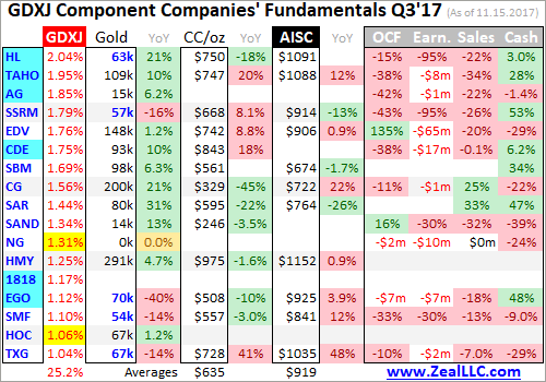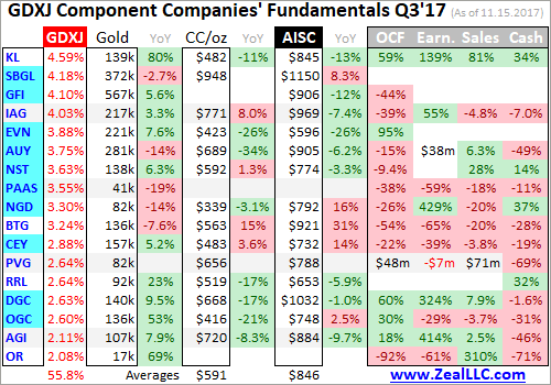 Fully 10 of GDXJ’s top 17 components weren’t even in this ETF a year ago in Q3’16. They alone now account for 34.5% of its total weighting. 16 of the top 34 are new, or 44.4% of the total. In the tables below, I highlighted the symbols of companies that weren’t in GDXJ a year ago in light blue. Today’s GDXJ is a radical departure from last year. Analyzing Q3’17 results largely devoid of real juniors is frustrating.