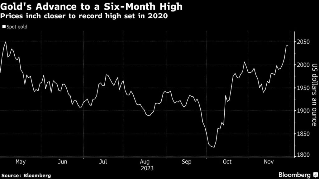Gold has rallied more than 11% since early October, initially fueled by haven buying in the wake of the Israel-Hamas war. Prices now are within sight of the record high set during the pandemic, supported by a drop in the yields paid by global bonds that are on track for their best month since 2008.