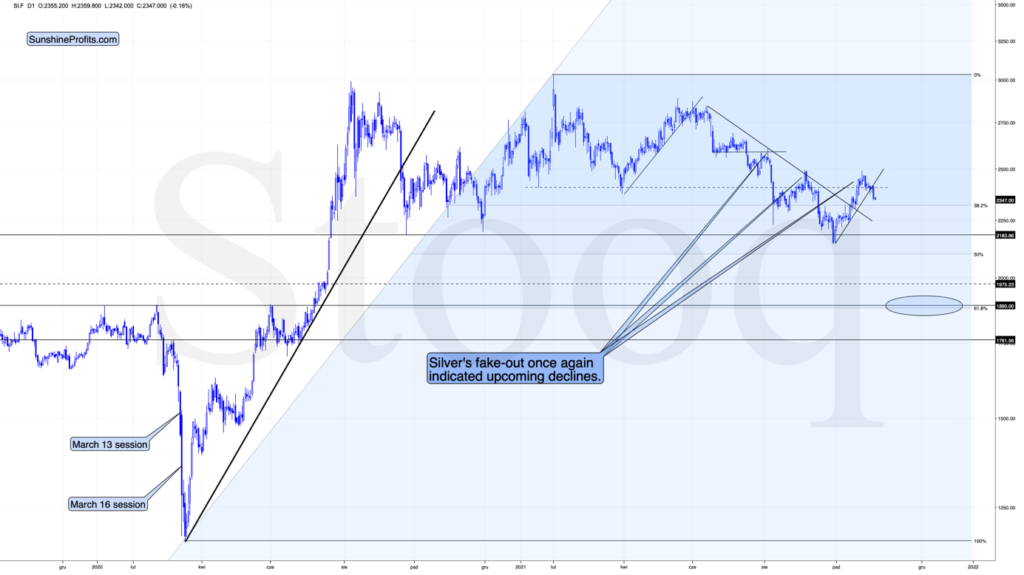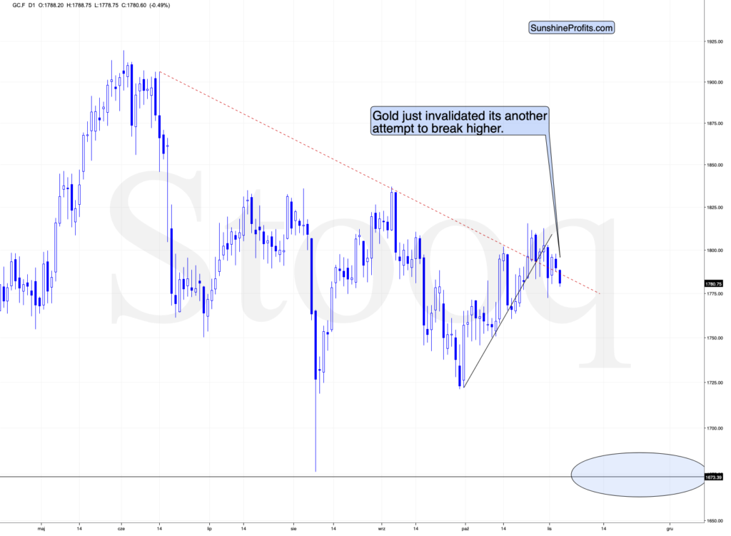 While yesterday’s session didn’t bring much lower gold prices (and the invalidation), today’s pre-market trading makes it clear that the attempt to break higher failed. Just like I had indicated yesterday.