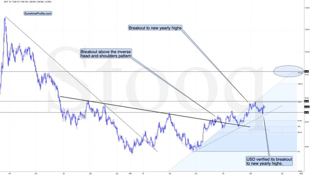 The USDX is after a verification of the breakout to new 2021 highs and after an about monthly consolidation above them. This is a perfect starting point for a major upswing, and we’re likely to see one soon.