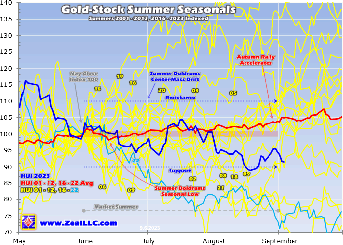 That’s not great, well behind where gold stocks should be with their seasonal autumn rally that amplifies gold’s own gathering steam in August. On average during these modern gold-bull years of 2001 to 2012 and 2016 to 2022, the major gold stocks of both the HUI and GDX left August climbing 3.9% across the whole summer. This week that underperformance widened, leaving gold stocks about 13.5% behind their mean.