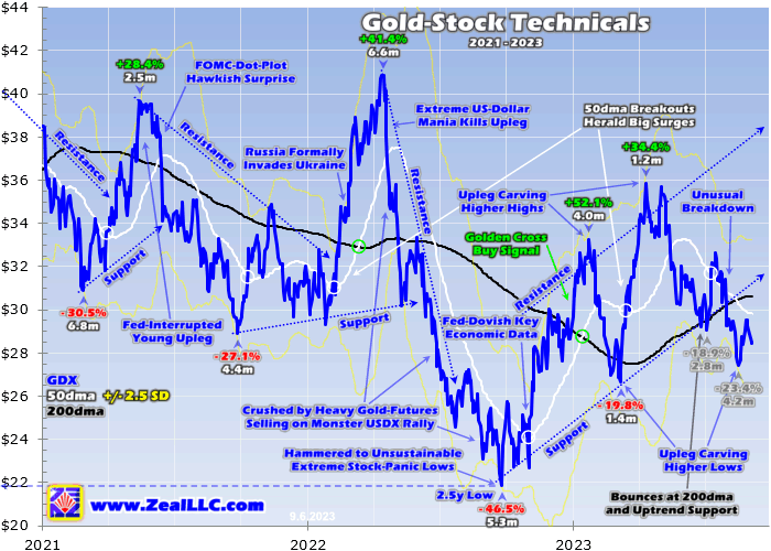 Gold stocks are ultimately leveraged plays on the metal they mine, as its price trends greatly impact their profitability. Gold surged into mid-July as well, then consolidated high near $1,975 even as the Fed hiked rates for the eleventh time in this monster cycle. But after closing at $1,974 that day with GDX still near $31.75, a freak turnover happened the next morning. The football was stripped right out of gold’s hands!