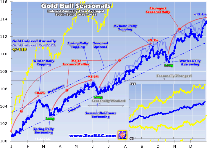 Gold’s hefty modern-bull-year seasonal gains mostly accrued in three distinct rallies, autumn, winter, and spring ones. They respectively averaged 5.1%, 8.6%, and 3.6% gains during this secular span. While all are worth riding, gold’s winter rally is easily the seasonal champion sporting the biggest upside. Surging 8.6% higher in just 4.1 months annualizes near a fast 25% rallying pace! Gold’s winter rally is quite powerful.