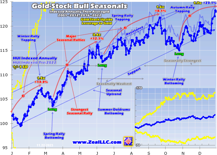 The major gold stocks enjoy parallel seasonal autumn, winter, and spring rallies mirroring and leveraging gold’s. Those averaged solid 8.1%, 13.3%, and 12.1% gains during these same 19 modern gold-bull years. That made for respective upside leverage to gold of 1.6x, 1.5x, and 3.4x. It also helped the HUI achieve big average annual gains of 23.1% over this long secular span! Gold stocks have proven major winners.