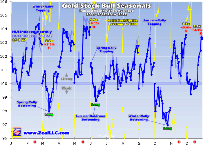 So during its bull-market years, gold has usually tended to enjoy powerful winter rallies driven by these sequential episodes of outsized demand. Naturally the gold stocks follow gold higher, amplifying its gains due to their excellent profits leverage to the gold price. Today gold stocks are now once again early on in gold’s strongest seasonal rally of the year, driven by this annually-recurring robust winter gold demand.