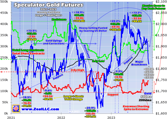 Any meaningful shift from a hawkish higher-for-longer bias to a dovish rate-cuts-are-coming-soon one will slam the lofty USDX. That will unleash that massive gold-futures mean-reversion buying to launch gold sharply higher. And there is enormous room for that, as evident in this chart. Note total spec longs’ upper-resistance line in recent years near 413k contracts, and shorts’ lower support running around 95k.