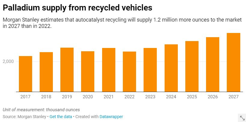 Demand from automakers will fall by around 400,000 ounces between 2022 and 2027, while supply from recycling of vehicles will increase by 1.2 million ounces, analysts at Morgan Stanley forecast.
