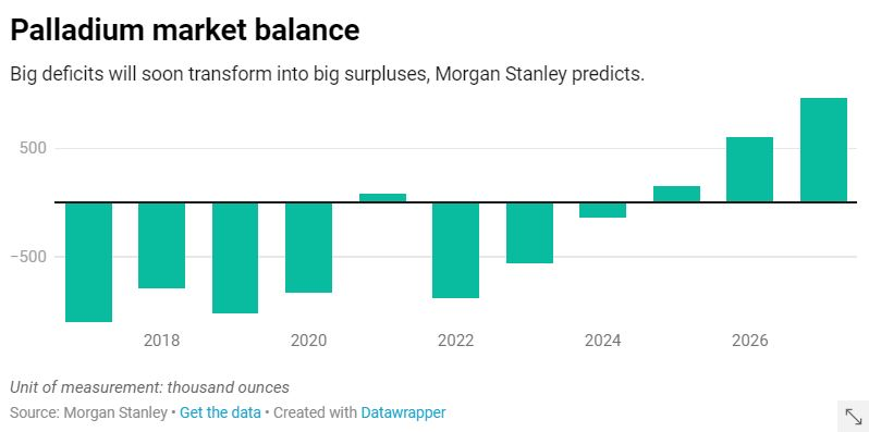 Macquarie sees demand from automakers rising this year and next and no palladium oversupply until 2025.