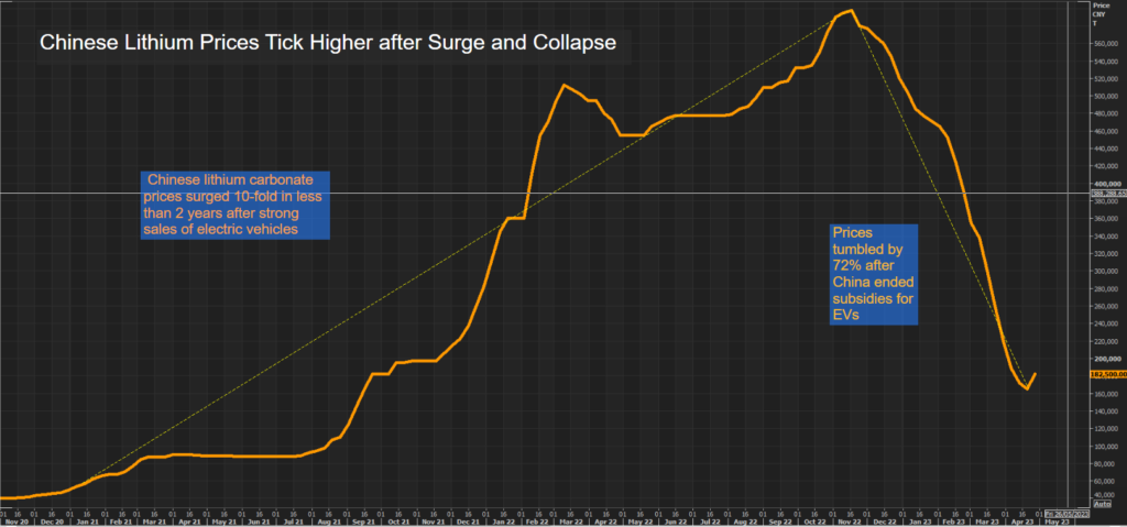 But prices tumbled 72% after China curbed EV subsidies in January, demand faltered and inventories rose.