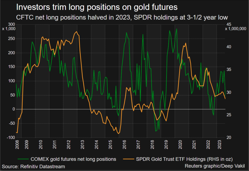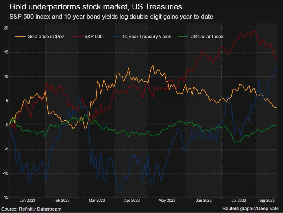 Equities have outperformed gold despite higher interest rates, while rival safe-haven Treasury bonds have attracted investors away from gold, which doesn’t earn any interest or dividends.