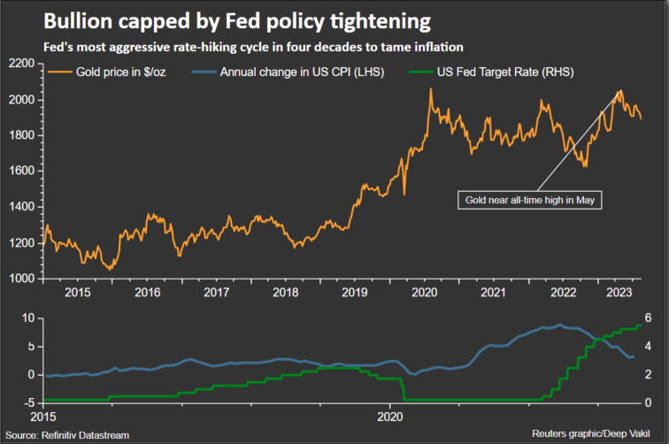 Investors typically buy gold during times of financial and economic uncertainty and rising inflation. This was seen in May when gold rallied to near-record highs during the US regional banking crisis.