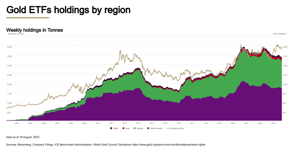 The biggest ETF, SPDR Gold Trust GLD, saw holdings dwindle to pre-pandemic levels.