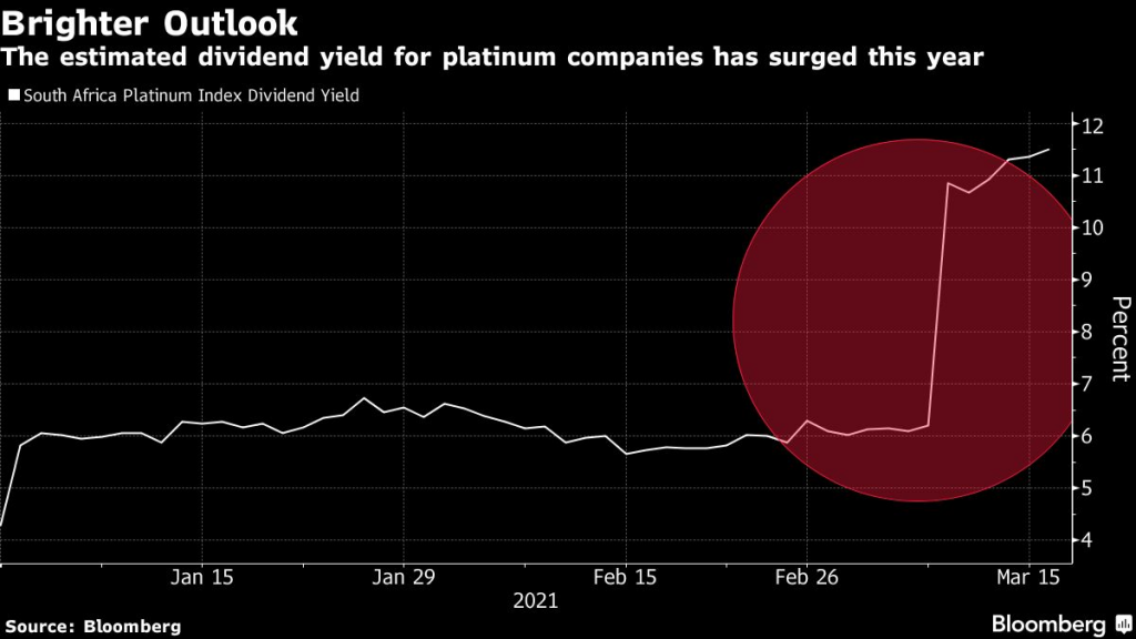 Estimated dividend yields on the platinum index have surged as earnings expectations are ratcheted higher, jumping to 11.5% from 4.3% at the end of 2020.