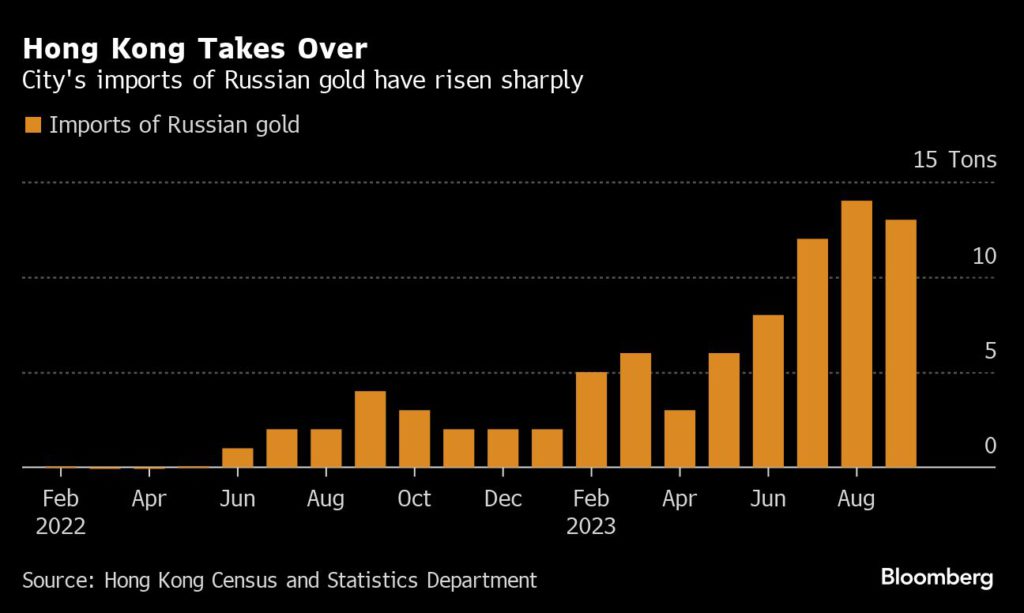 The city has long been a key conduit for bullion entering the Chinese mainland — the world’s biggest consumer market — but since April, Russian shipments surged. Hong Kong imported 68 tons of Russian gold this year, four times as much as the whole of 2022.