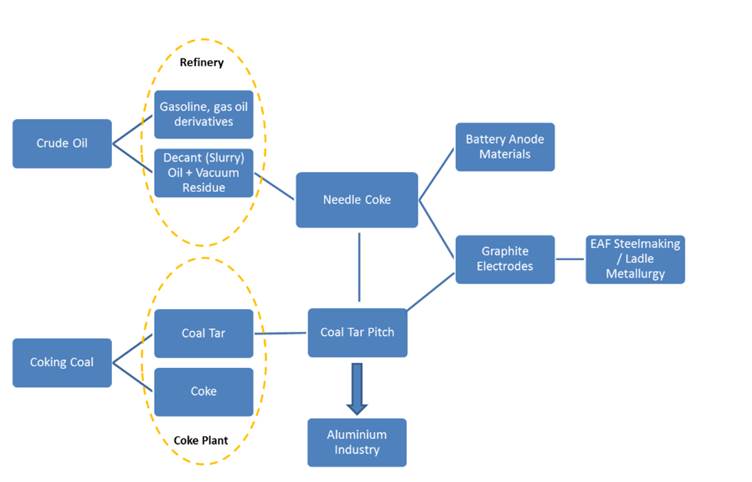 There are two main types of needle coke. Petroleum needle coke is produced at oil refineries by converting decant or slurry oil, along with high-quality vacuum residue, both by-products of the refining process. Coal-based needle coke (sometimes called ‘pitch needle coke’, or just ‘pitch coke’) is made from coal tar pitch, a by-product of coking metallurgical coal for blast-furnace steelmaking.