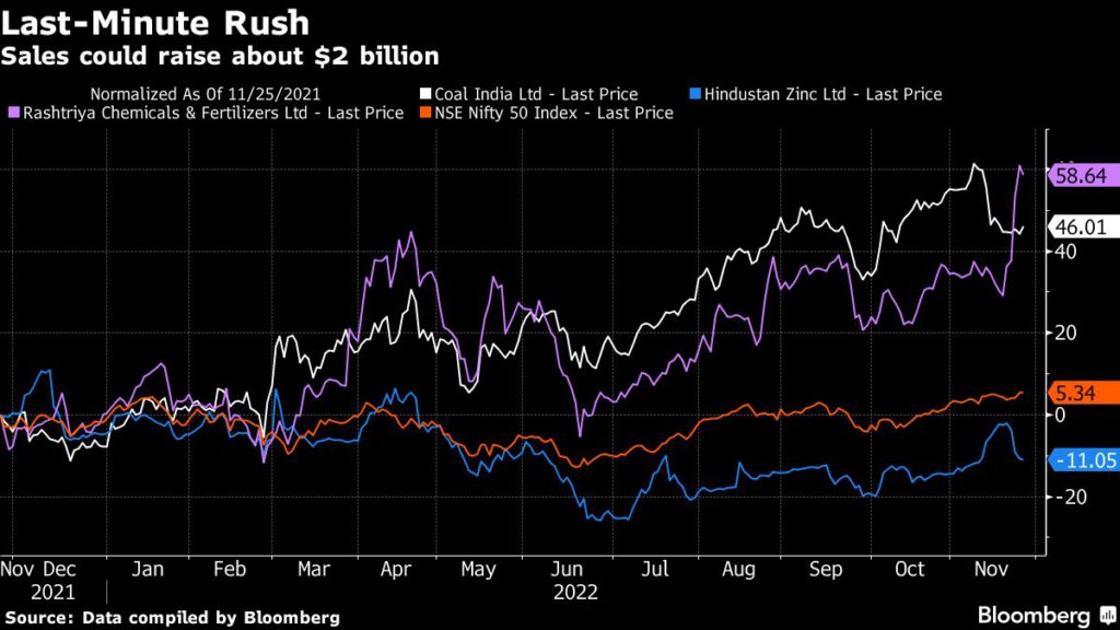 The government is looking to sell 5%-10% in Coal India Ltd., Hindustan Zinc Ltd., Rashtriya Chemicals and Fertilizers Ltd. via the so-called offer-for-sale mechanism, the people said, asking not to be identified as the details aren’t yet public. In all, five firms could be chosen, including a listed entity under the railway ministry, they added.