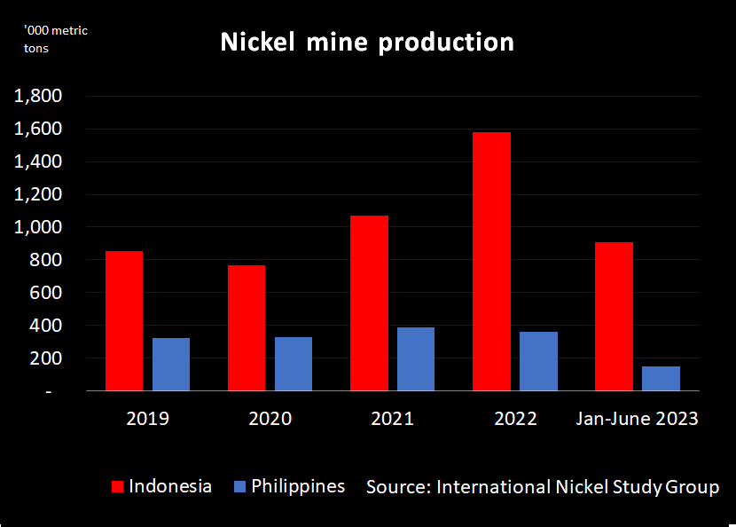The Philippines mined 360,000 tons of nickel in ore in 2022, or 11% of global supplies, according to INSG.