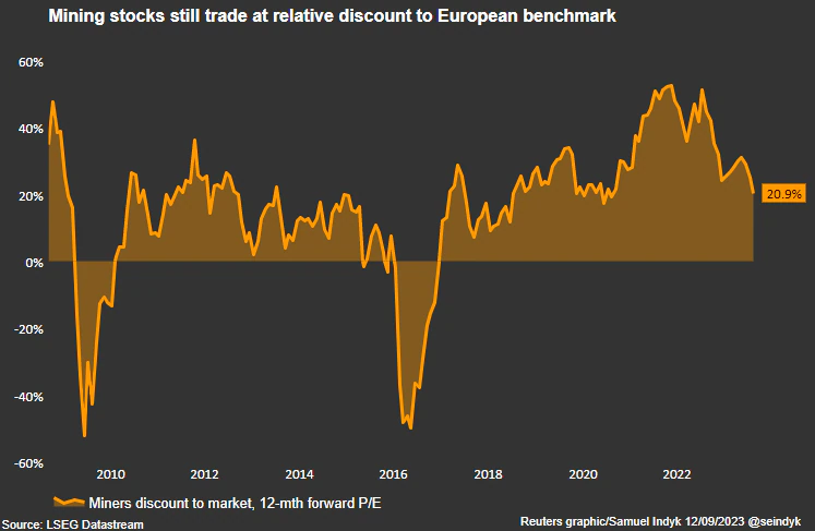 The STOXX basic resources index trades at over a 20% discount to the STOXX 600. Miners trade at a 12-month forward price-to-earnings ratio of 9.8, compared to 12.3 for the market, according to LSEG Datastream.