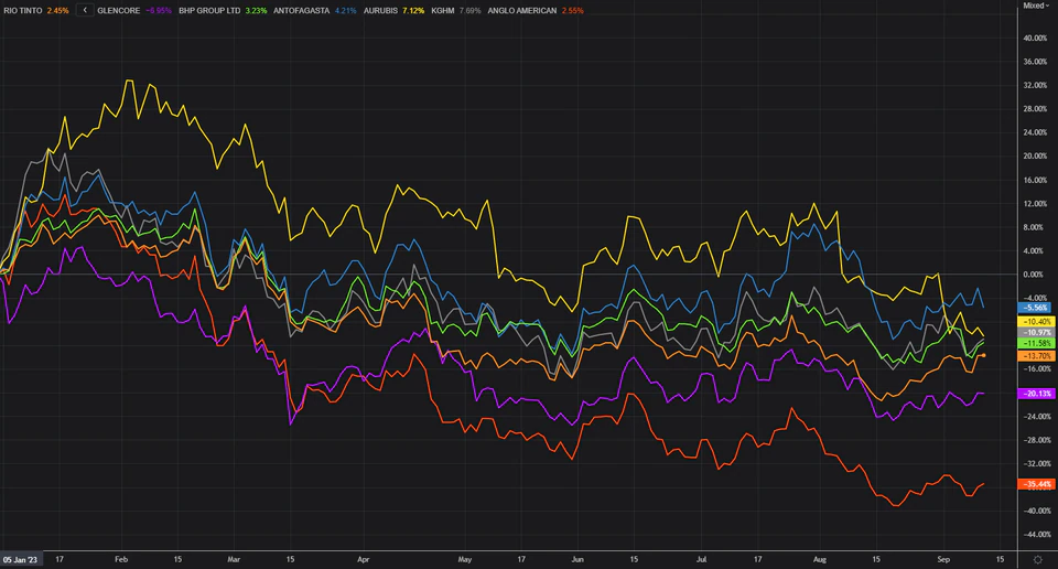 The STOXX Europe 600 mining index has fallen 15% this year, making it the worst performing sector in the region by some margin, with second-placed real estate down 4.5% and the top-performing retail index up 27%.