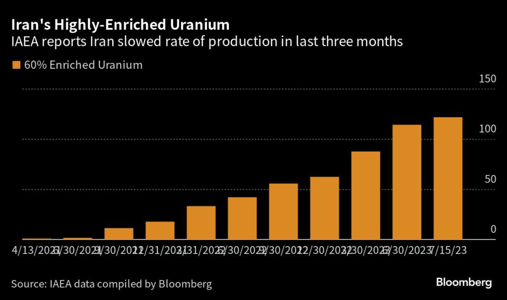 Iran’s stockpile of uranium enriched to 60% levels of purity rose to 121.6 kilograms (268.1 pounds) compared with 114.1 kilograms in June, the IAEA inspectors concluded. Inventories of 20%-enriched fuel grew to 535.8 from 470.9 kilograms.