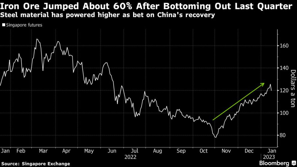 China takes about 70% of the world’s iron ore exports, and the commodity is highly sensitive to expectations for government-backed stimulus. Economists have rushed to boost forecasts for Chinese growth since President Xi Jinping ditched Covid Zero, and other raw materials have also gained. Copper breached $9,000 a ton for the first time since June, while shares in top global miner BHP Group hit a record on Monday.