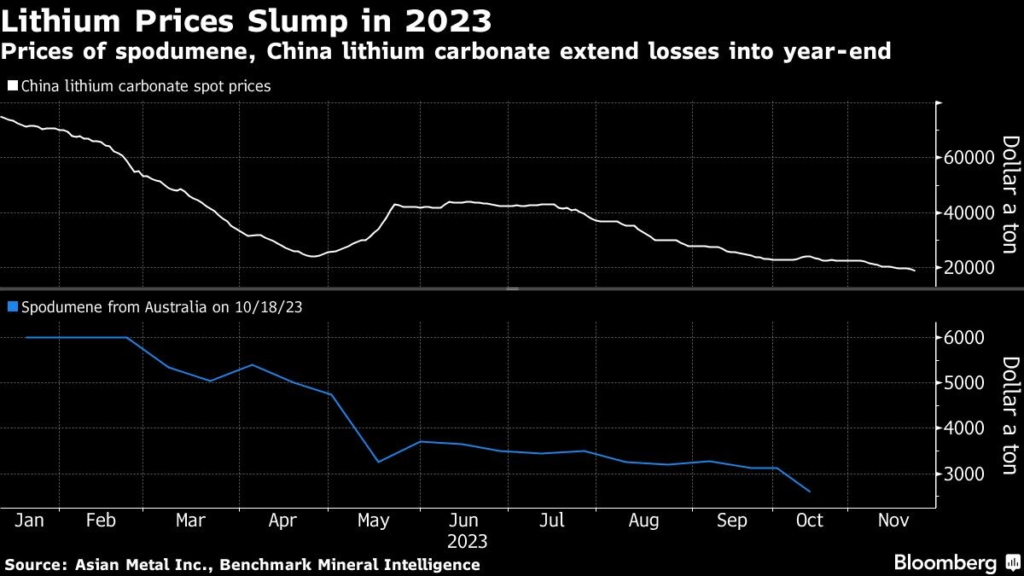 Chinese prices of lithium carbonate, a semi-processed form of the metal, fell 2.3% on Thursday, and are down 20% so far this month. The last time they posted a daily gain was on Oct. 25. Spodumene, the lithium-bearing rock mined in Australia, has more than halved in 2023.