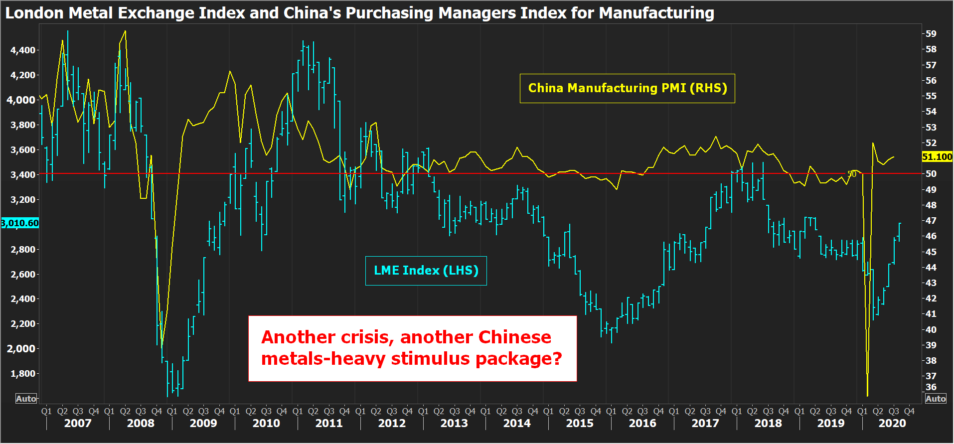China’s “shock and awe” stimulus package during the last financial crisis ended up not just dragging metal prices off multi-year lows but propelling many of them to all-time highs.