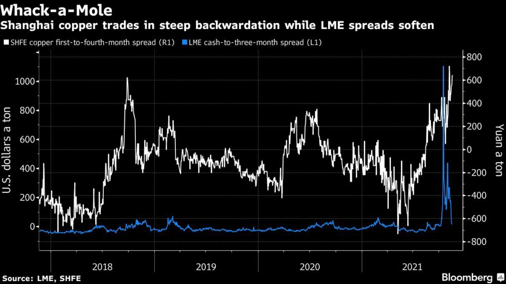 In the case of copper, for instance, there’s a growing backwardation in Shanghai Futures Exchange contracts, even as LME spreads retreat from all-time highs seen during an unprecedented supply squeeze last month.
