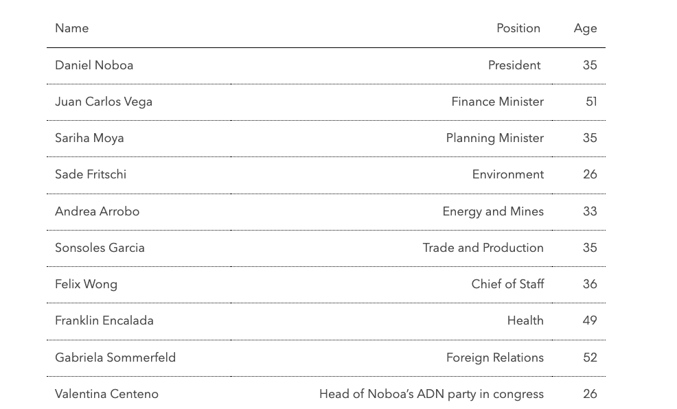 Noboa’s chief of staff and the ministers of trade, public works and education are all in their thirties, while his health minister is 49 and his appointment for head of foreign relations, Gabriela Sommerfeld is 52.