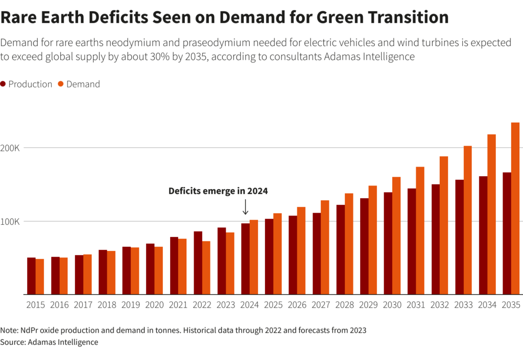 That, Adamas says, is equivalent to some 8% of expected demand for the two rare earths, vital for making permanent magnets to power EV and wind turbine motors.