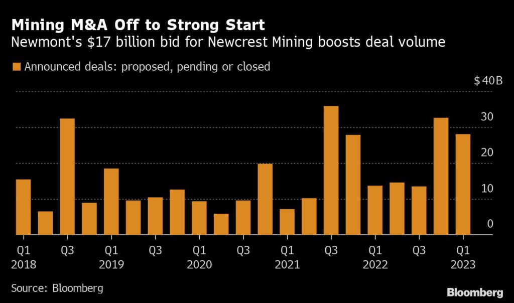 Newmont’s proposal to buy Newcrest in early February — the biggest gold mining takeover ever, if it happens — set the tone for M&A this year. That one deal accounts for a lion’s share of the $28 billion in announced mining takeovers tracked by Bloomberg in the first quarter. While the number of deals in the first quarter is down from last year, there’s good reason to think activity could gather steam as executives meet at PDAC starting Sunday.
