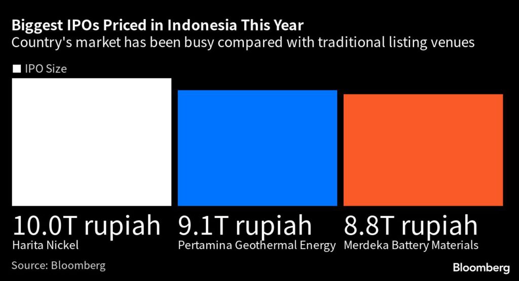 Prior to Harita Nickel, 11 companies debuted in Jakarta after raising at least $500 million, according to data compiled by Bloomberg. Within that group, three dropped on the first day of trade, two ended unchanged and six finished above the listing price. The average increase for the first session was 8.1%, the data show.