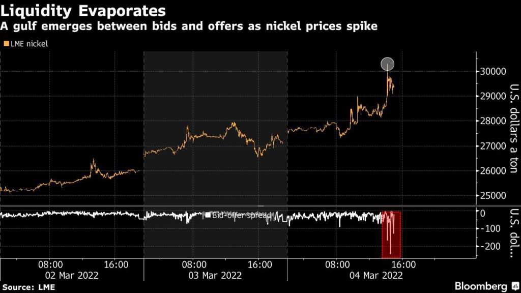 The latest spike comes as clients with short positions have been stopped out of the trades, a nickel trader involved in the transactions said. Clients such as industrial hedgers have been hit with large intraday margin calls as prices have surged this week on worries of supply disruptions from Russia, and they’re now being forced to close out their positions in an increasingly illiquid market, the person said.