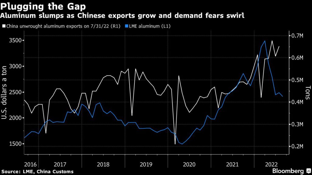 Traders are also monitoring power issues in China, where Sichuan province — a significant aluminum hub — is rationing electricity amid soaring temperatures. China boosted exports in recent months to help plug the gap overseas, and a reversal in that trend could underpin prices even as risks to demand grow.