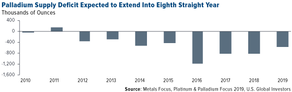 As I’ve explained before, the metal is surging because it’s not only in high demand thanks to tougher emissions standards around the world, particularly in Europe, but it’s also expected to post another year of supply deficits. 2019 should mark the eighth straight year of deficits, according to Metals Focus. That’s largely because around 80 percent of all palladium (and platinum) production is concentrated in two countries—South Africa and Russia. The geopolitical risks, then, are very high. Just last month, we saw aggressive wage negotiations begin in the South African platinum mining industry. The Association of Mineworkers and Construction Union (AMCU), one of the groups involved in these talks, has called for a whopping 48 percent rise in the minimum wage.