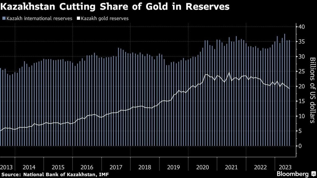 In a turnaround that’s already taken it from one of the world’s biggest gold buyers to a top seller this year, Kazakhstan’s central bank is looking to cut the metal’s share to as low as half of its $34.5 billion reserves.