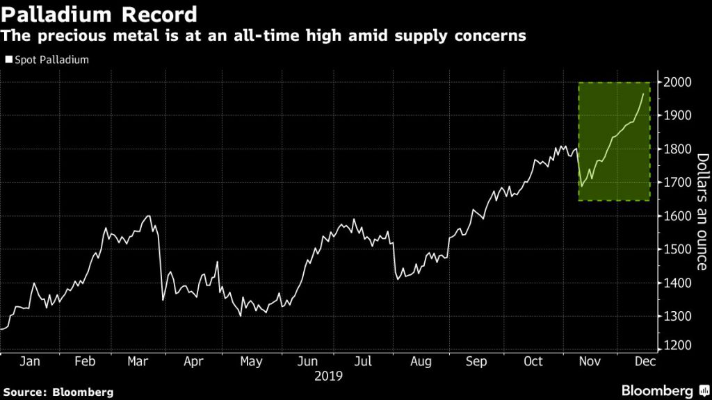 Prices climbed for an unprecedented 16th day after signs of a breakthrough in the U.S.-China trade talks, fueling hopes for a rebound in the auto industry, palladium’s biggest consumer. The metal that reached another record surged this week as mining disruptions in major producer South Africa threatened to tighten a market already hobbled by a persistent deficit.