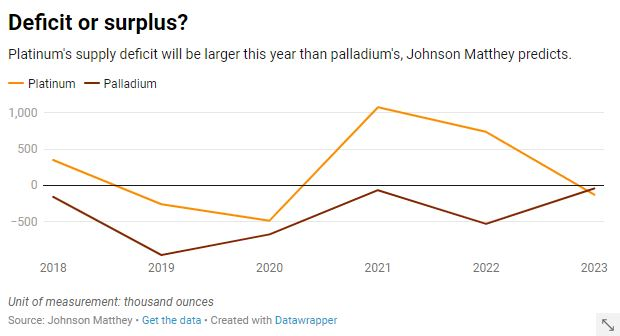 The palladium market is still expected to be in undersupply this year, with consultants Metals Focus seeing a deficit of 707,000 ounces and specialist materials maker Johnson Matthey a shortfall of 43,000 ounces in the roughly 10 million ounce a year market.