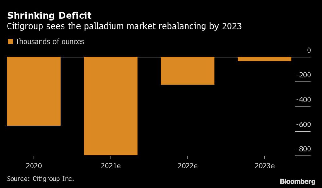 - Citigroup Inc. said in mid-July that it expects palladium to rise to $3,200 an ounce within three months and doesn’t see platinum substitution becoming sizable until 2023 or 2024.